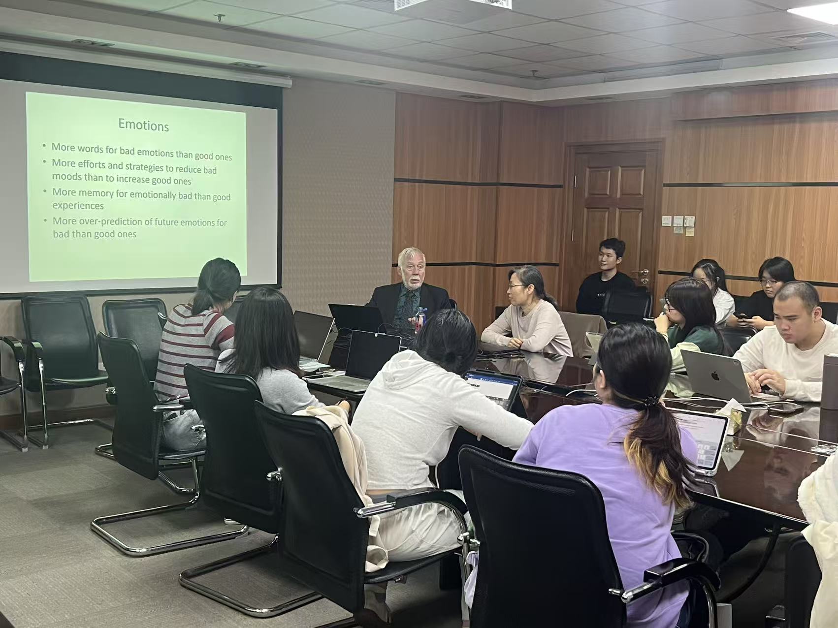 2025年10月15日下午14:00 ,面向本科生的第二场讲座在后主楼2026开展。本次主题为“坏比好影响更大”。讲座系统阐述了心理学中的一个基本原则——负面偏差,即负性刺激、负性事件相比正性事件而言,对人的心理和行为具有更强大、更持久的影响。Baumeister教授通过跨领域的研究证据说明了这一效应的普遍存在:在人际关系中,一次冲突或负面互动的伤害远大于多次积极互动的益处;在学习中,惩罚和批评比奖励能带来更快的效果;在认知上,人们会更多地思考和分析负面经历,从而学到更多;在感知和记忆中,大脑对负面信息的处理更优先、更深刻;在道德判断上,一个负面行为足以摧毁由众多善行建立的声誉。随后讲座进一步探讨了该偏差的进化根源:对于生存而言,避免一次致命危险远比获得一次额外奖励更重要。