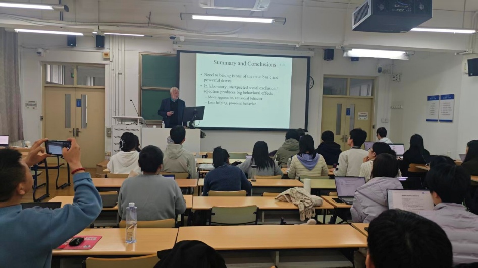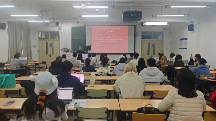 本次活动共包含九场主题讲座,内容涵盖“未来思考”“社会归属与排斥”“自尊机制”“自我控制与决策”“情绪功能与学习幻觉”“自我本质探析”以及“自我毁灭行为的心理路径”等心理学前沿议题,系统呈现了人类心理机制的丰富维度与研究深度。在每场讲座最后的交流环节,听众围绕理论与实践的结合点踊跃提问,议题涉及教育实践中的前瞻思维培养、跨文化背景下的自尊表现、情绪功能的测量与运用、人工智能时代的人际价值,以及抑郁与自我损耗等心理健康议题。Baumeister教授以其深厚的学术积淀与清晰的逻辑表达,引导听众重新审视自我、情绪、行为与社会之间的关系,为参与者在个人发展、教育实践与心理健康等领域提供了理论支持与实践方向。众多师生表示受益匪浅,期待未来能举办更多此类高水平的学术交流活动。