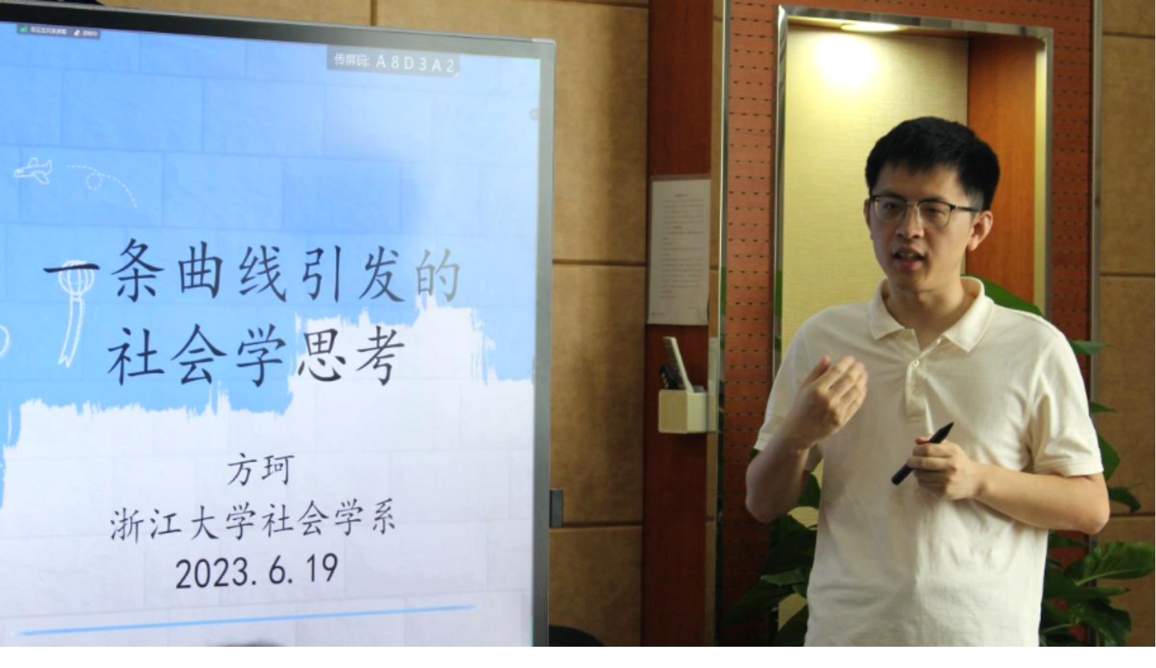 2023年6月19日上午,公司举办了“一条曲线引发的社会学思考”讲座。浙江大学公共管理公司社会保障与风险管理系教授张翔和浙江大学社会学系博士后方珂作为主讲人进行了主题演讲,分享了他们的研究观察与写作心得。公司社管党支部书记刘冰教授、游祥斌教授、杨丽副教授、杜静元副教授、杨林博士后和来自中国人民大学、辽宁大学、西北大学和浙江农林大学等其他高校的本硕博师生共30余人线下线上参与讲座。公司民生保障研究中心主任谢琼教授主持了整场讲座。