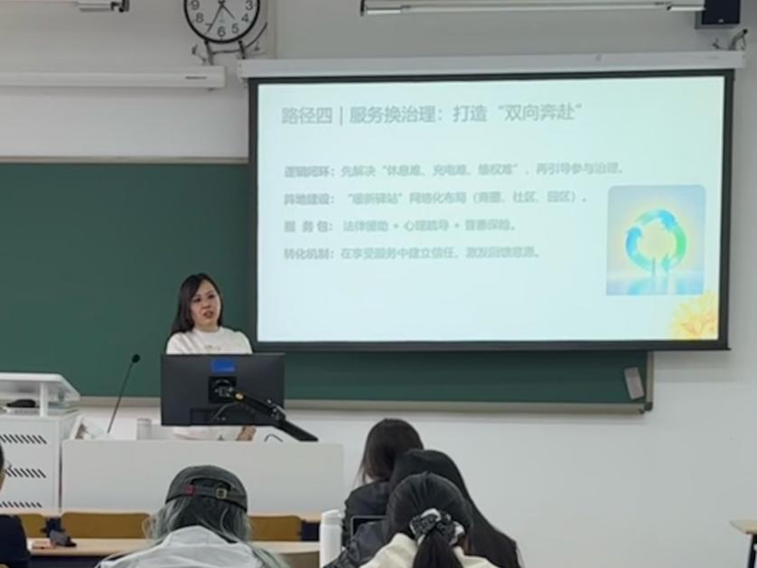 讲座伊始,李艳副秘书长围绕新就业群体参与社会治理的时代背景与现实困境展开系统阐释。她指出,快递小哥、外卖骑手、网约车司机等新就业群体已成为城市运行的“毛细血管”。基于实地调研数据,李艳副秘书长勾勒出以高流动性、强工具性、弱组织性、高关注度为特征的新就业群体画像。她强调,当前新就业群体普遍面临权益保障不足、社会认同度不高、参与渠道不畅、组织动员难度大的现实困境,推动该群体从治理“局外人”转变为基层治理“合伙人”,是推进基层治理现代化的重要课题。