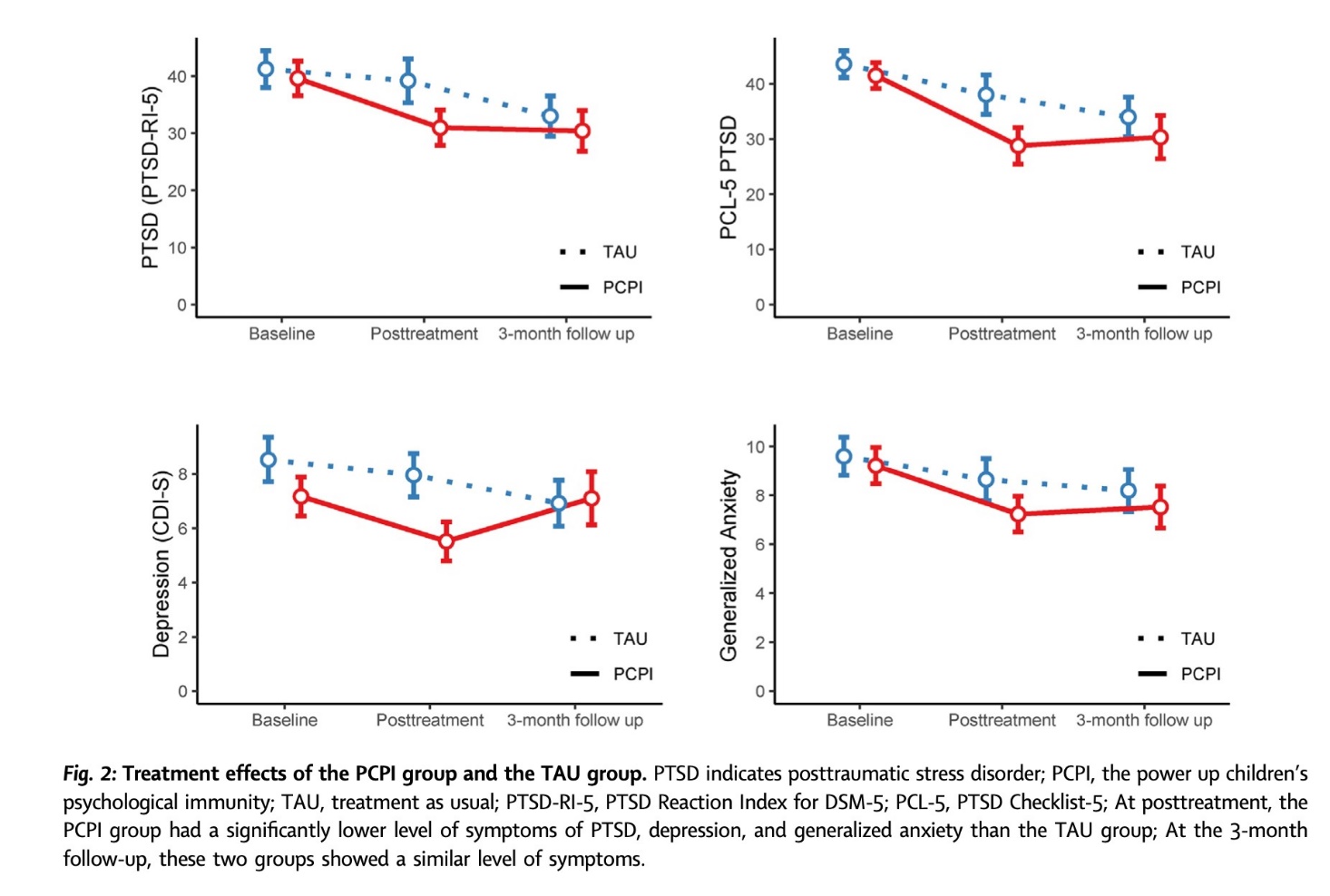 课题组所开发的7次小组(配合约3次个案)的干预方案(PCPI)能够显著降低我国儿童心理创伤的严重性,且这种干预方案具备简便易行的特点,可由经过培训的社会工作者在公司环境下进行递送。当然,其长远效果还需更多的研究去进一步验证。