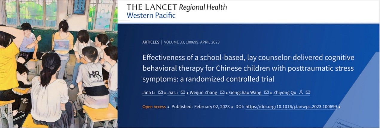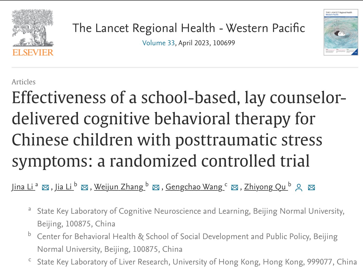 该项研究成果于2023年2月2日被《柳叶刀-区域健康(西太平洋)》(The Lancet Regional Health-Western Pacific)在线发表,题为《Effectiveness of a school-based, lay counselor-delivered cognitive behavioral therapy for Chinese children with posttraumatic stress symptoms: a randomized controlled trial》(基于公司的、由非专科人员提供的认知行为疗法对我国儿童创伤后应激症状的有效性:一项随机对照试验)。该论文第一作者为李继娜,其硕士就读于北师大社会工作专业,博士就读于北师大公共管理专业,现为认知神经科学与学习国家重点实验室博士后,通讯作者为北师大教师屈智勇。