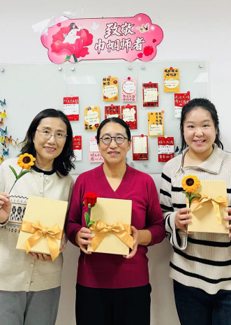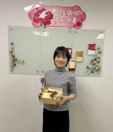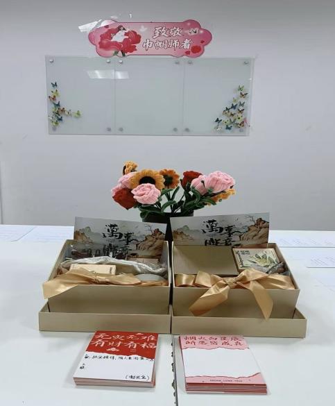 活动最后,公司工会向参加活动的教师赠送节日礼品和象征幸福的绒花。老师们手持绒花与祝福卡片,在“致敬巾帼师者,三八节快乐”的背景板前合留影,记录下这一温馨的节日时刻。