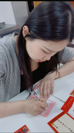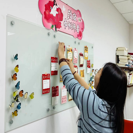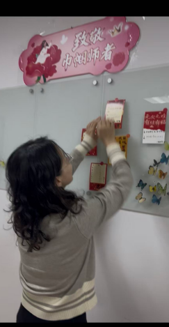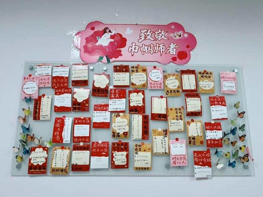 在“祝福语对对碰”互动环节,将楹联拆分为上联与下联卡片,参与者在现场填写创作能够匹配的另一半,完成一副完整的祝福楹联。老师们不仅饶有兴趣地填对联,还有老师在空白卡片上写下新的祝福语,与同事一起完成“对联”。如“春风化雨润桃李、巾帼书香映讲台”。还有老师留下温暖而真挚的节日祝福。如“愿书香常伴,桃李满园,祝所有女同事节日快乐”;也有员工写下:“谢谢老师们用温柔与坚韧照亮我们的成长道路,祝老师们节日快乐!”等等。这些朴素而真诚的文字,使活动现场洋溢着温暖的情感。通过这样的互动方式,使节日祝福不再只是单向表达,而成为同事之间交流情感的重要契机,从而进一步增强公司集体的凝聚力和归属感。